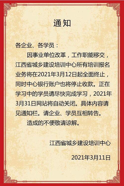 因事業(yè)單位改革,工作職能移交,江西省城鄉(xiāng)建設(shè)培訓(xùn)中心所有培訓(xùn)報名業(yè)務(wù)將在2021年3月12日起全面終止,同時中心銀行賬戶也將停止收款。正在學(xué)習(xí)中的學(xué)員請盡快完成學(xué)習(xí),2021年3月31日網(wǎng)站將自動關(guān)閉。具體內(nèi)容請見通知欄。請企業(yè)、學(xué)員互相轉(zhuǎn)告。